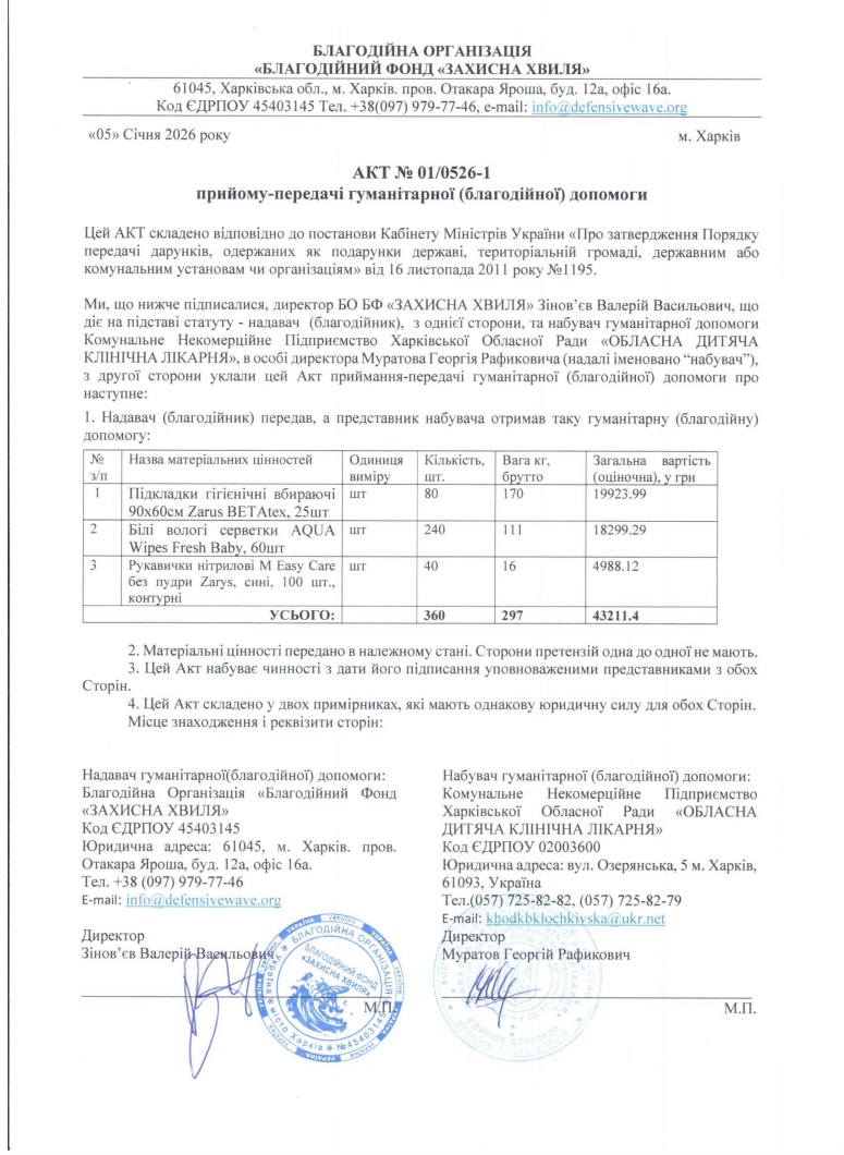 Благодійний фонд «Захисна Хвиля» успішно реалізував черговий проєкт допомоги Обласній дитячій клінічній лікарні м. Харкова — «ОДКЛ», спрямований на забезпечення закладу базовими медичними розхідними матеріалами.